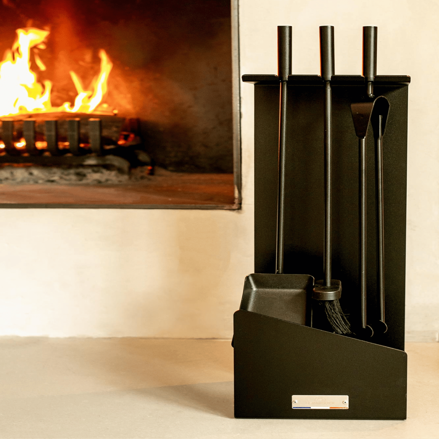 This black painted steel fireplace tool set offers an elegant silhouette and discreet storage for its three utensils (shovel, broom, tongs). Its modern design is crafted to conceal the accessories, ensuring a clean and uncluttered fireplace area.