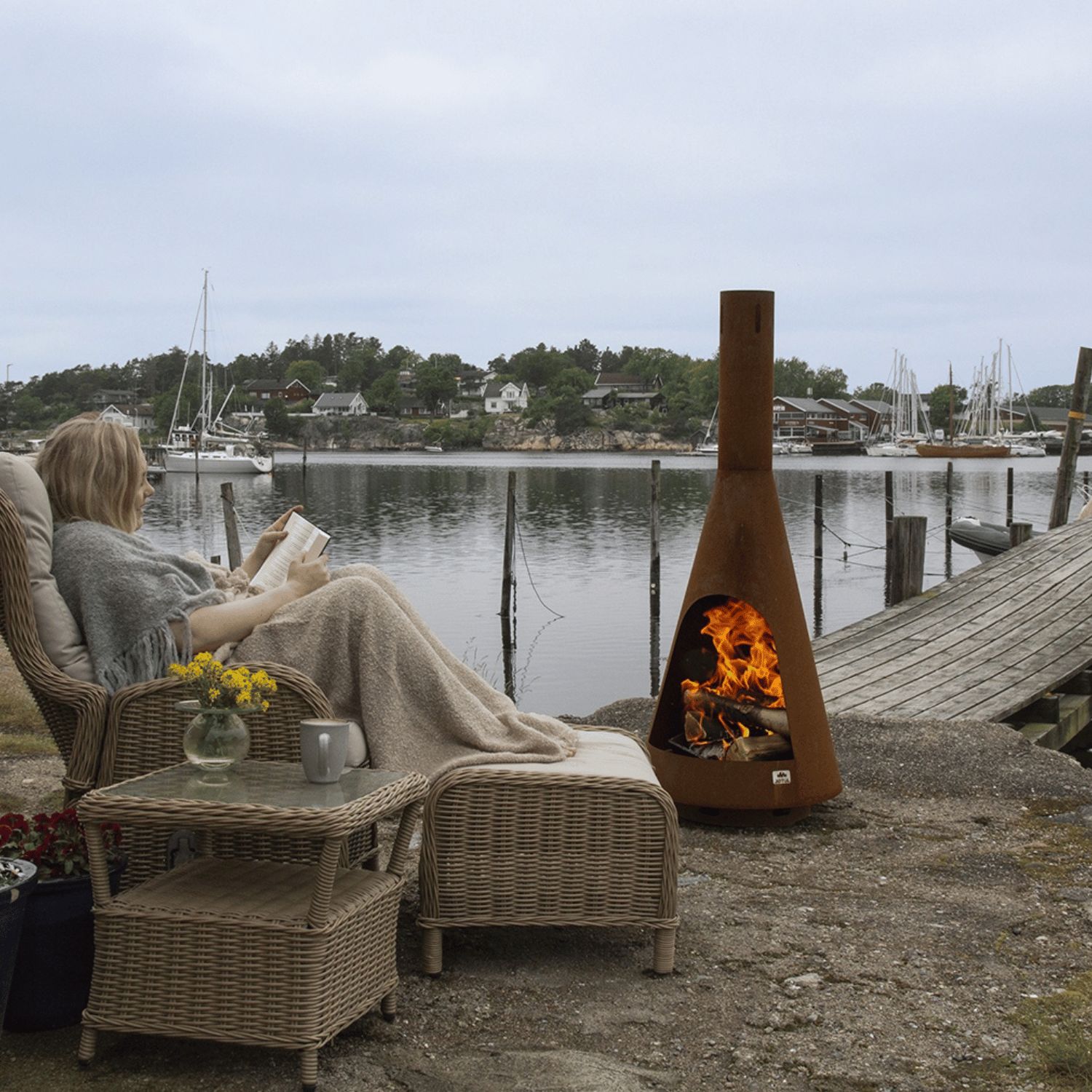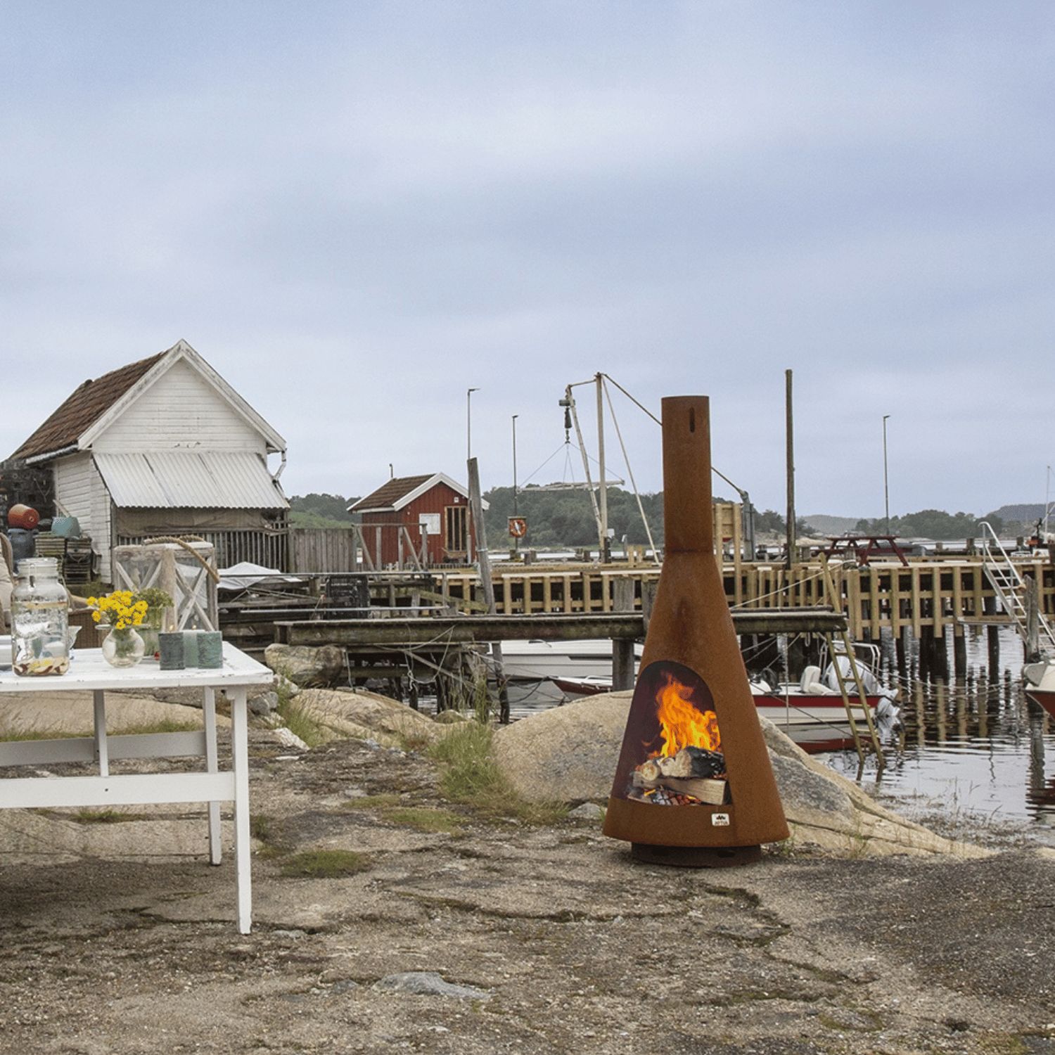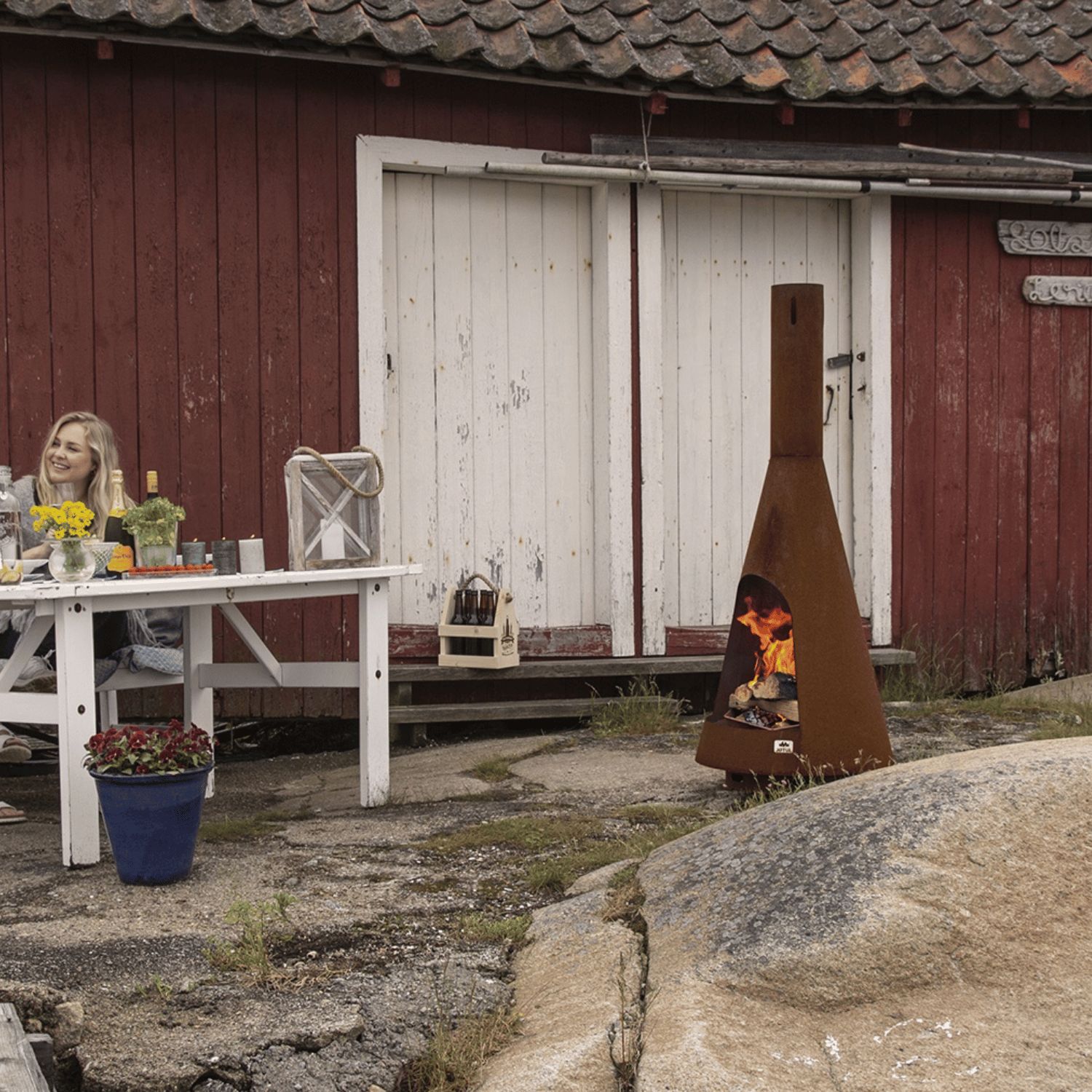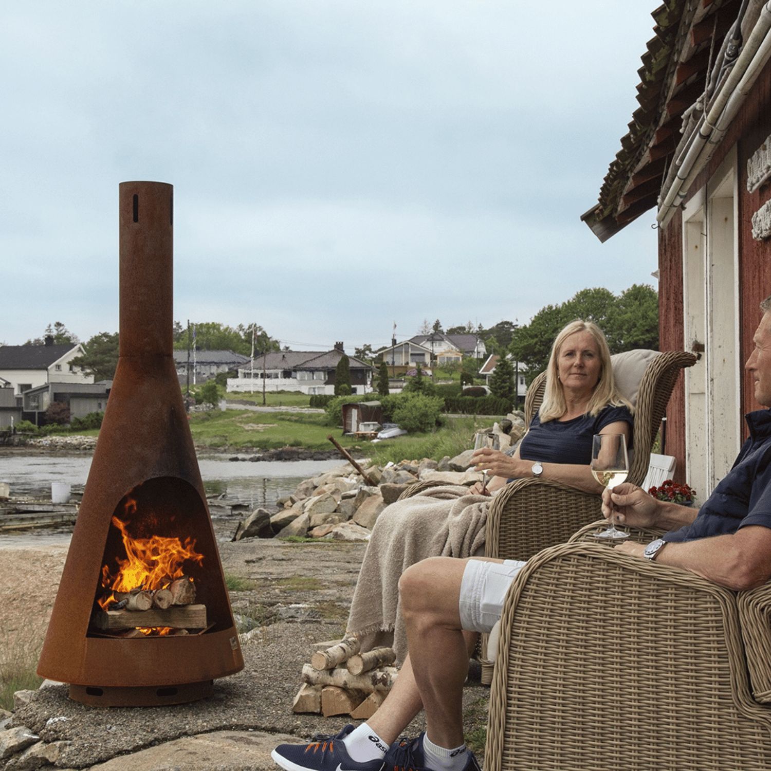 Simply light your Frøya outdoor fireplace to create a warm atmosphere and bring family and friends together outdoors, no matter what the weather. The warmth and light it provides creates an inviting atmosphere for any social setting. The Jøtul Frøya is available in Corten steel and is designed to withstand all types of weather all year round. It will make your outdoor space even more inviting.