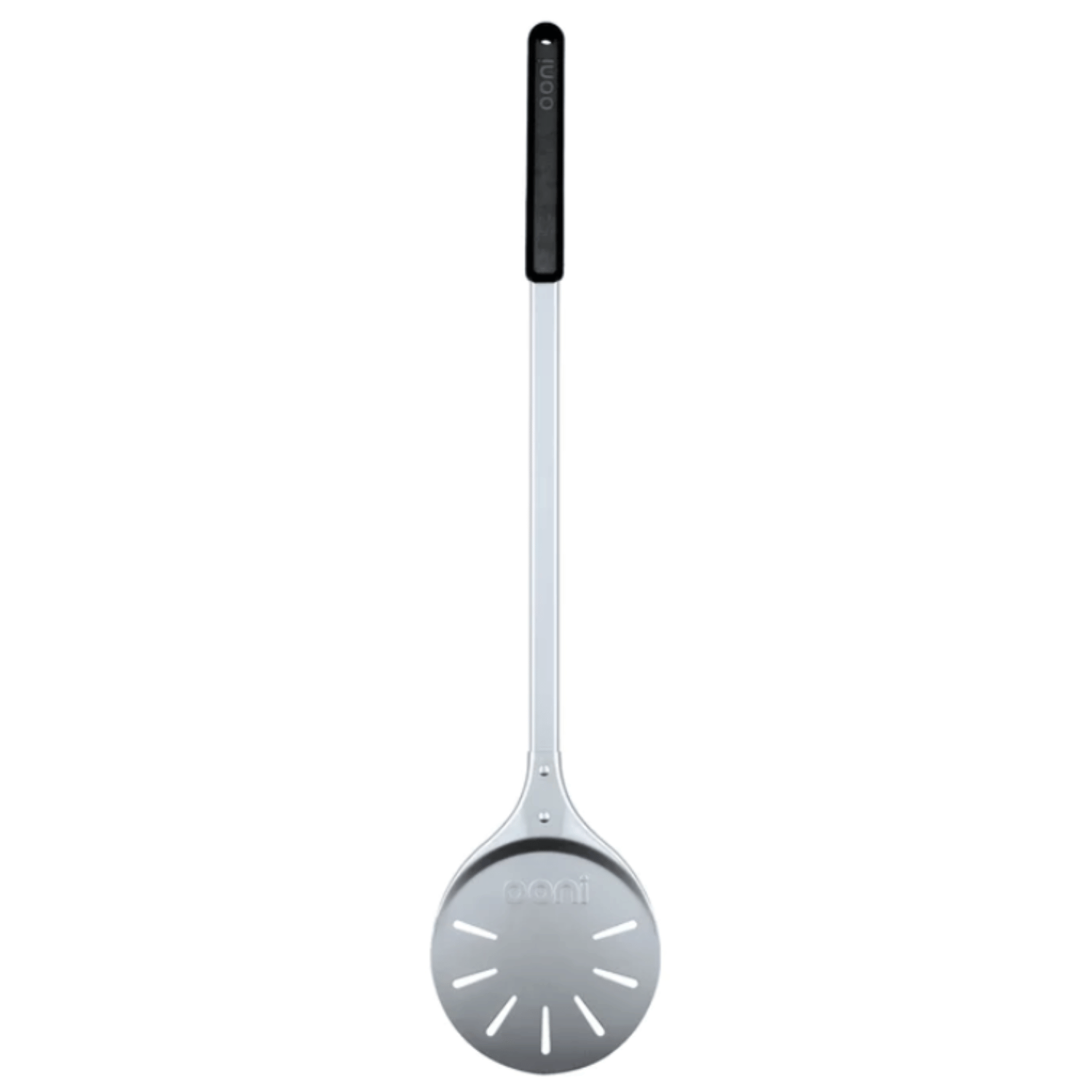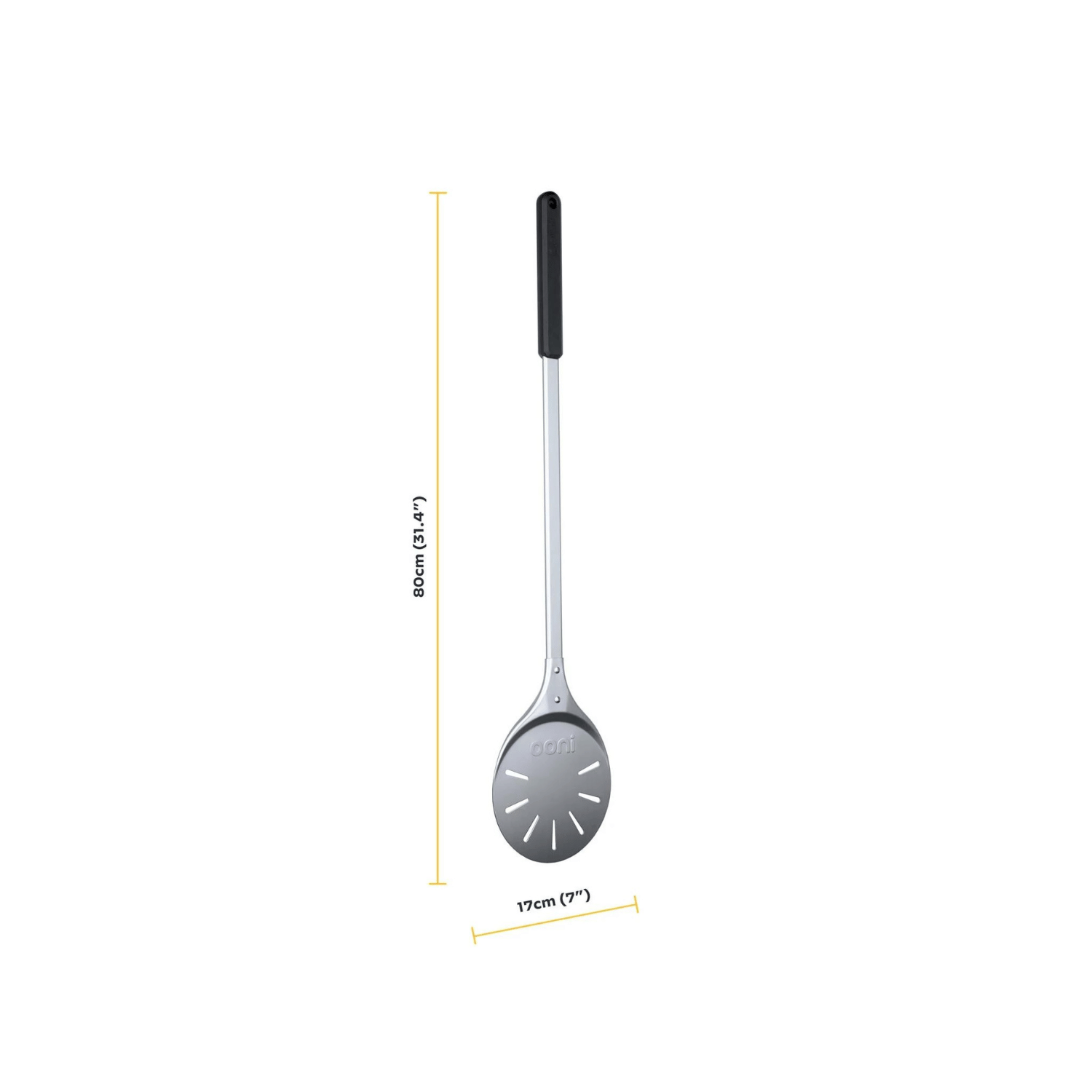 Cook your pizzas faster with the Ooni Pizza Turning Peel, keeping pizzas in contact with the stone baking board as you spin them like a pro in your flaming-hot Ooni pizza oven. The seven-inch, durable anodised aluminium surface has a non-stick effect for sliding right under pizzas, while the perforations let excess flour fall away for a perfectly cooked pizza base.